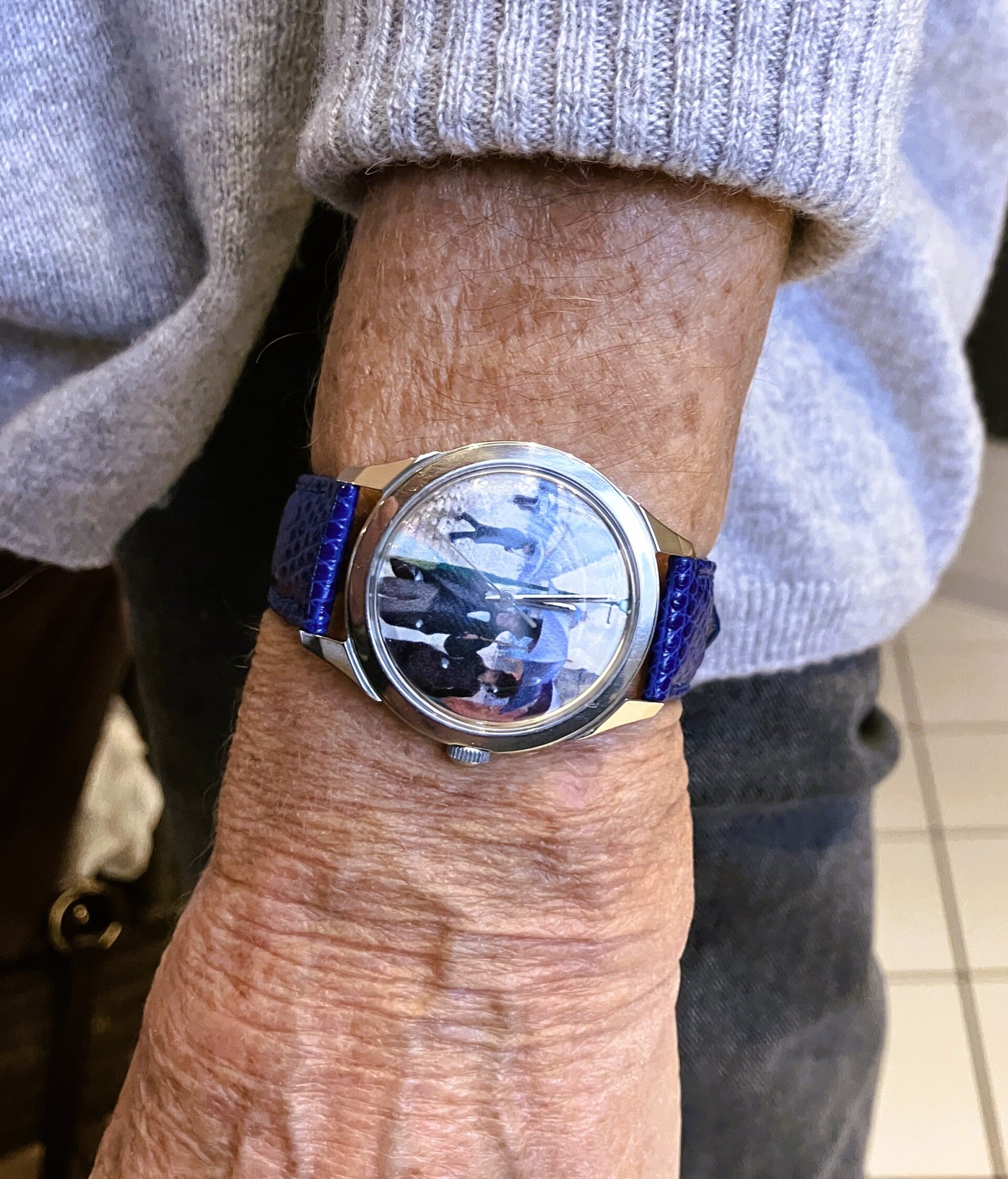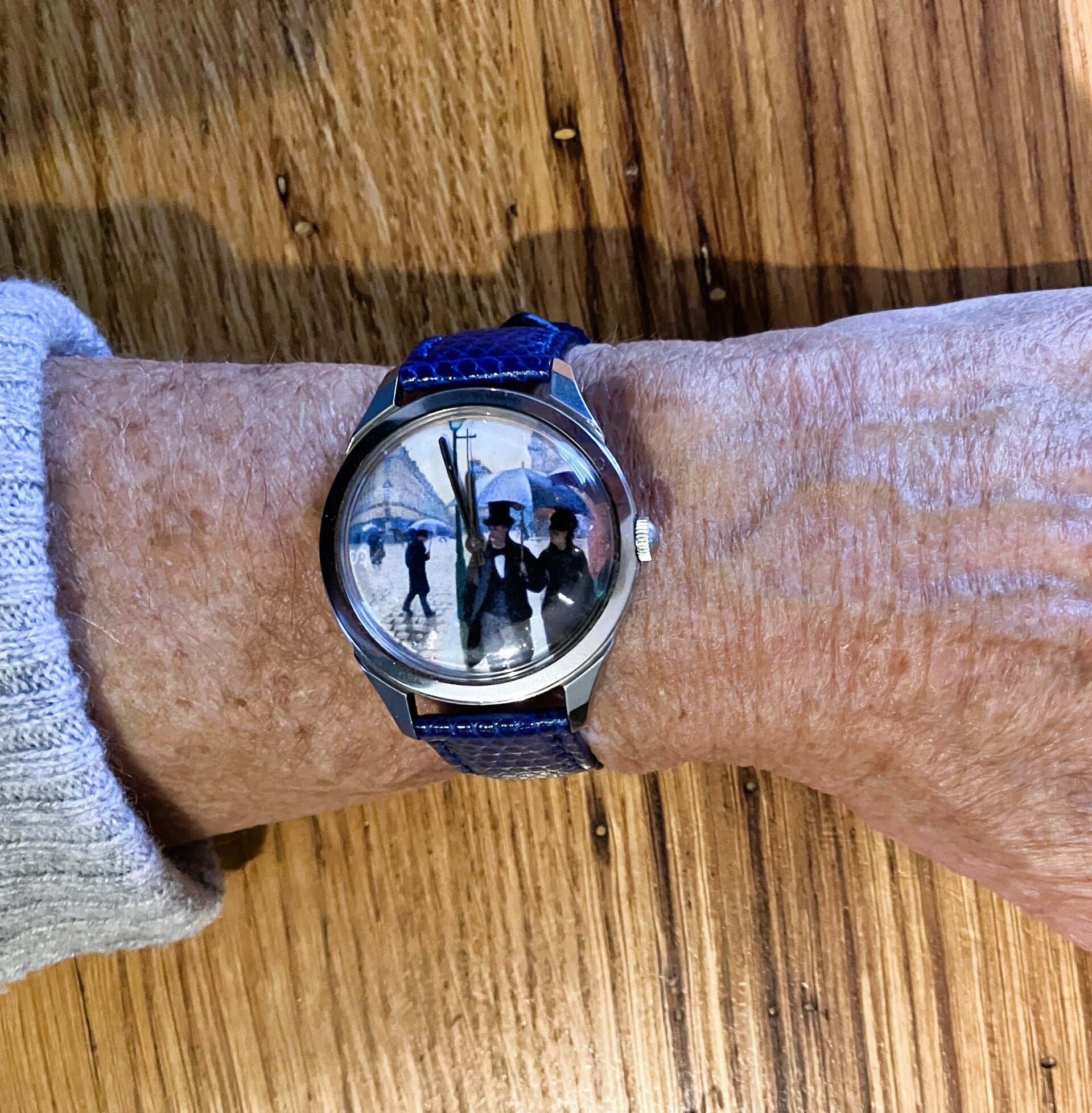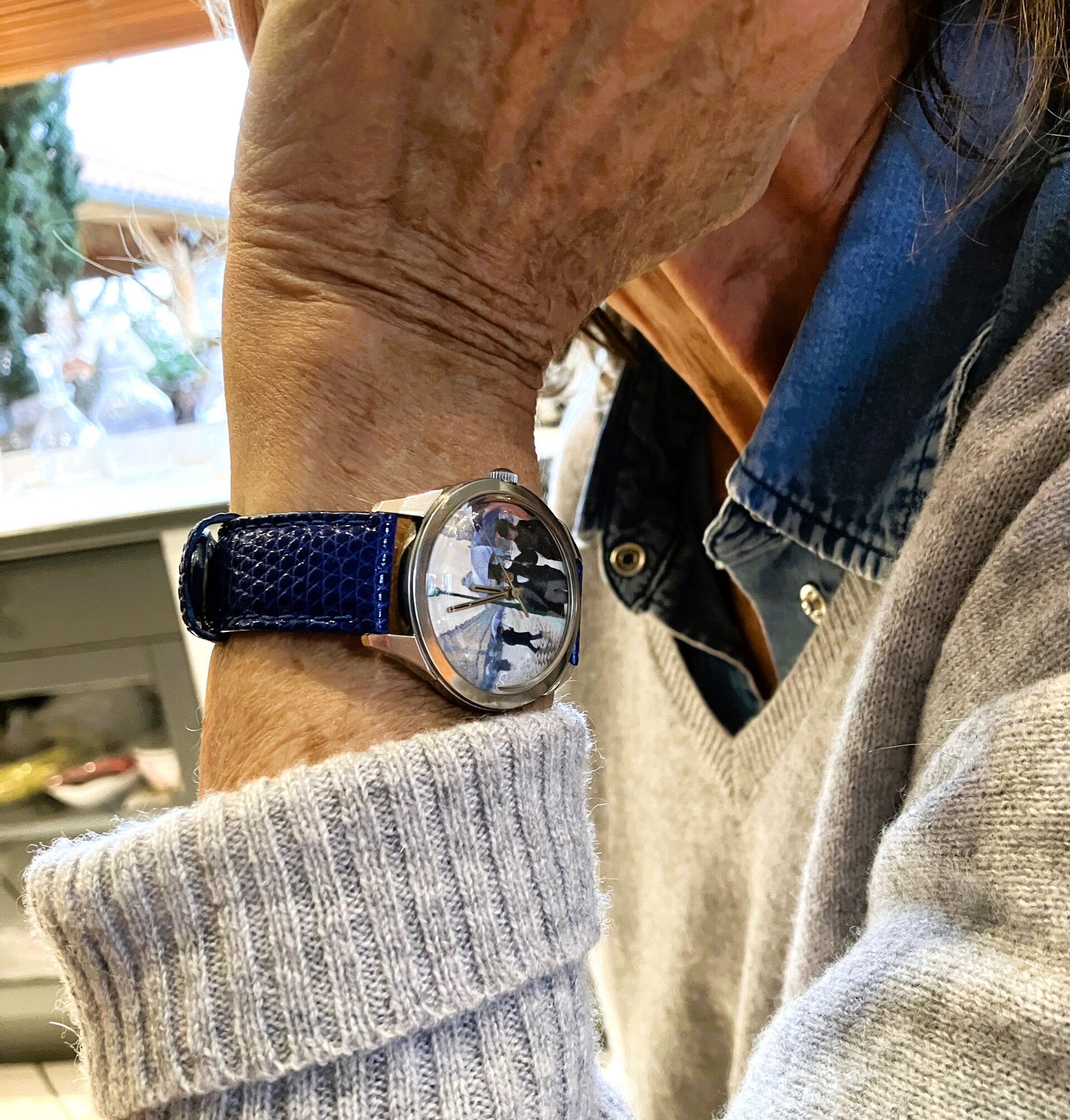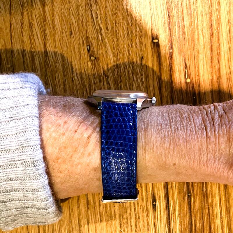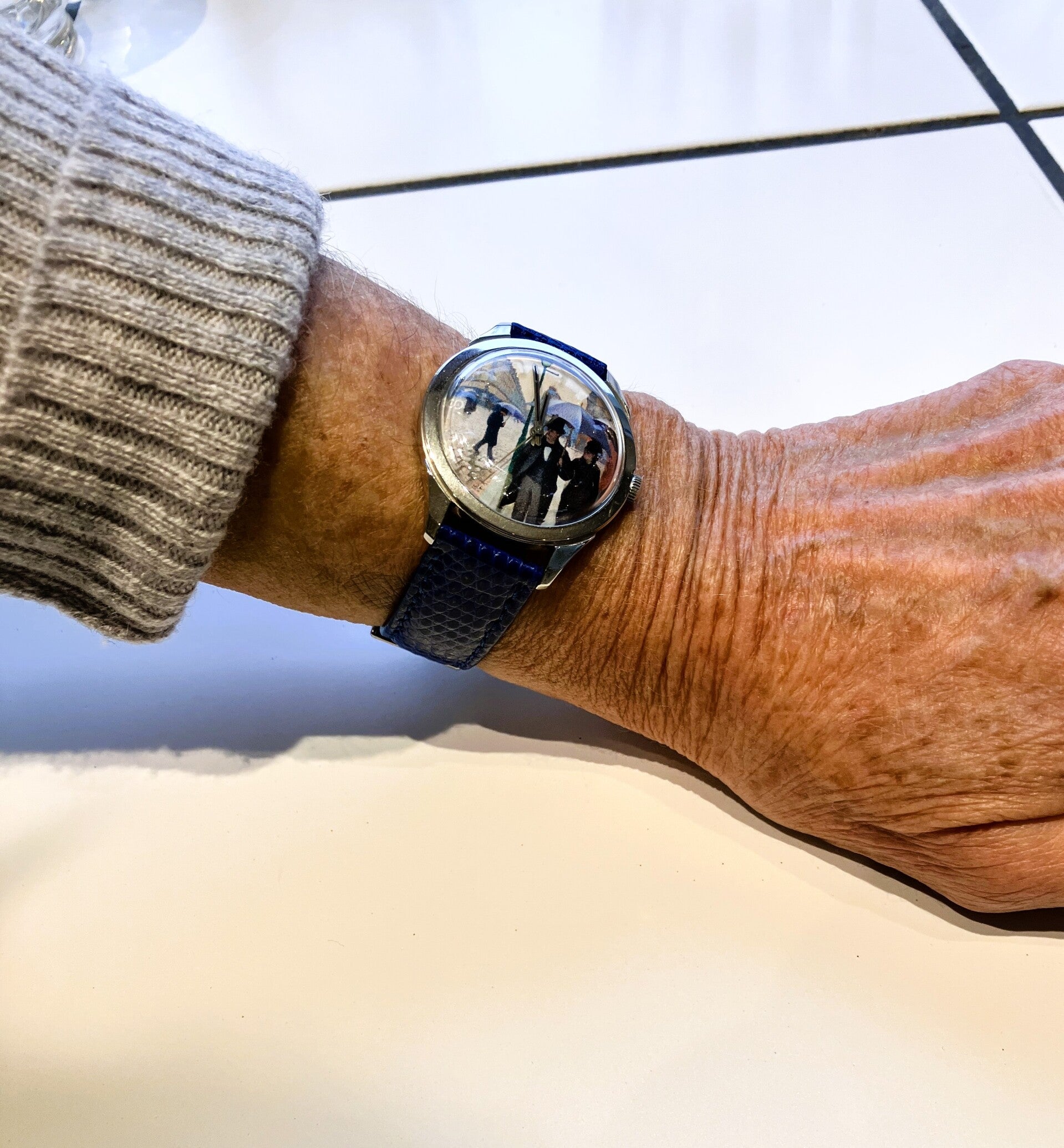 Montre posée sur une table mais sur le côté, une position courante lorsque l’on lit un livre ou lors d’un repas lorsque les poignets reposent sur la table (il est rare que les mains soient à plat. Par ailleurs c’est une bonne position à la différence des coudes sur la table) ou encore au volant d’une voiture.