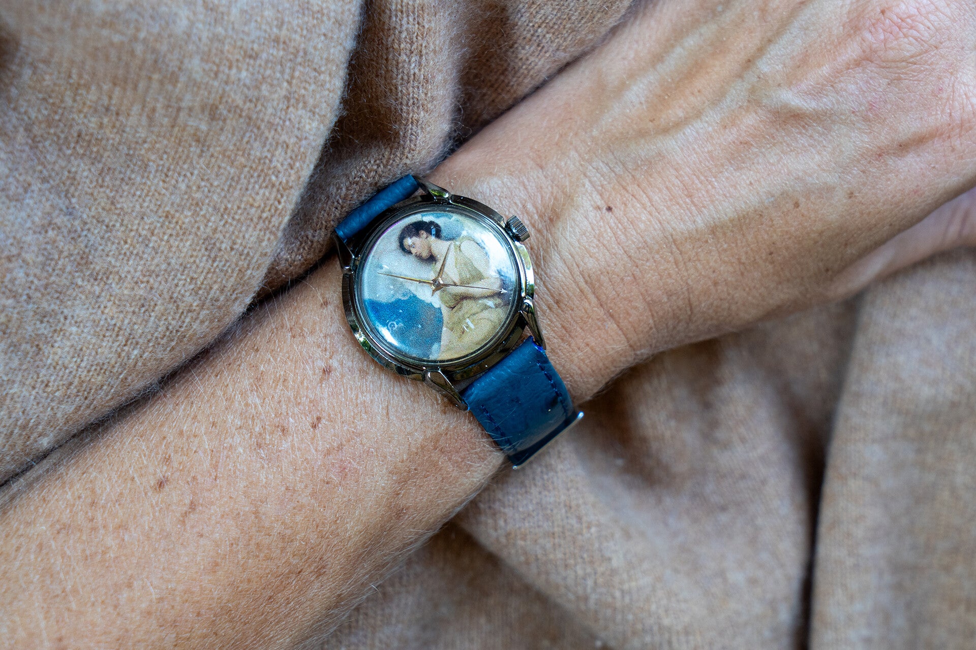 Abbott Handerson Thayer est un peintre américain né au 19ème siècle en 1849 et décédé en 1921. Il a peint Winged Figure en 1889 dont on retrouve la partie principale de l’œuvre sur le cadran. Un cadran qui accroche la lumière avec ses couleurs et la finesse du trait qui sont mises en valeur par le plexiglas et donnent l’impression que l’on est au Art Institute à Chicago devant l’œuvre originale. Un pur régal de pouvoir contempler cette pièce unique à son poignet.