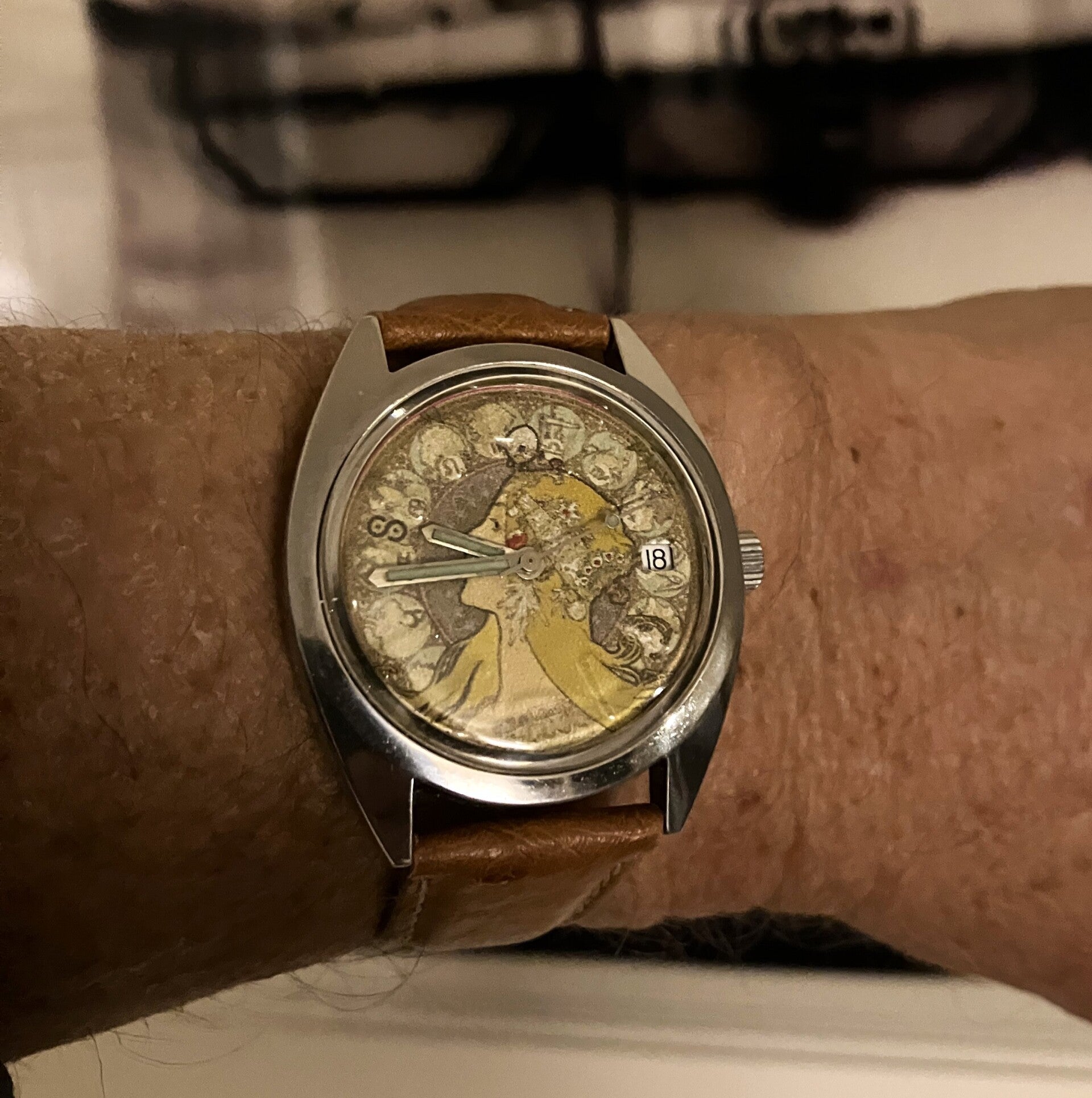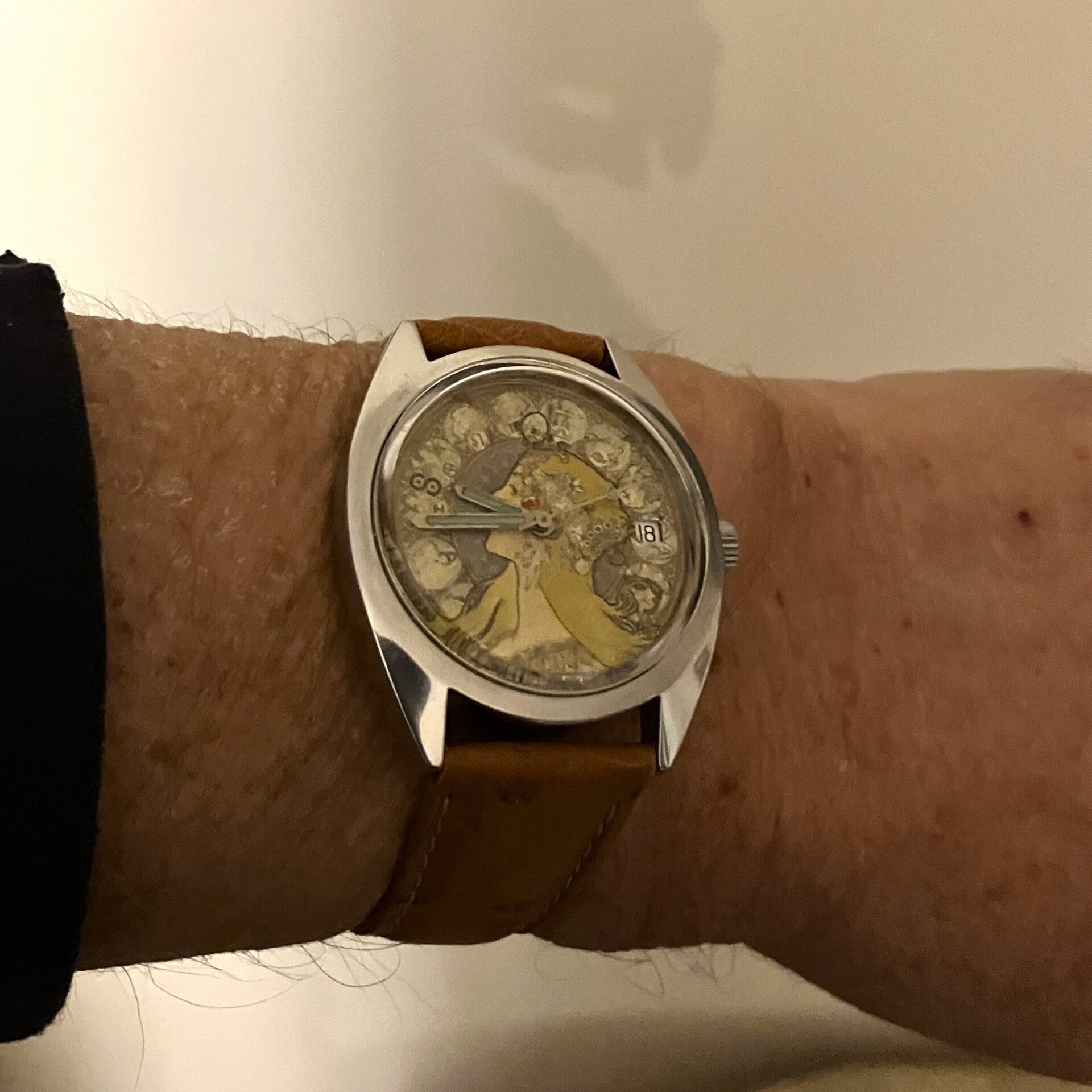 Nos horloger, graphiste et designer ont eu beaucoup de plaisir à réviser entièrement ce calibre FHF, à étudier et sélectionner le meilleur détail du tableau de Mucha et à l’associer à cette montre de plus de 65 ans d’âge. Le bracelet que nous avons choisi pour cette montre Aurore est un bracelet en Autruche véritable avec un toucher inimitable et qui s’accorde parfaitement avec le cadran d’Alphonse Mucha.